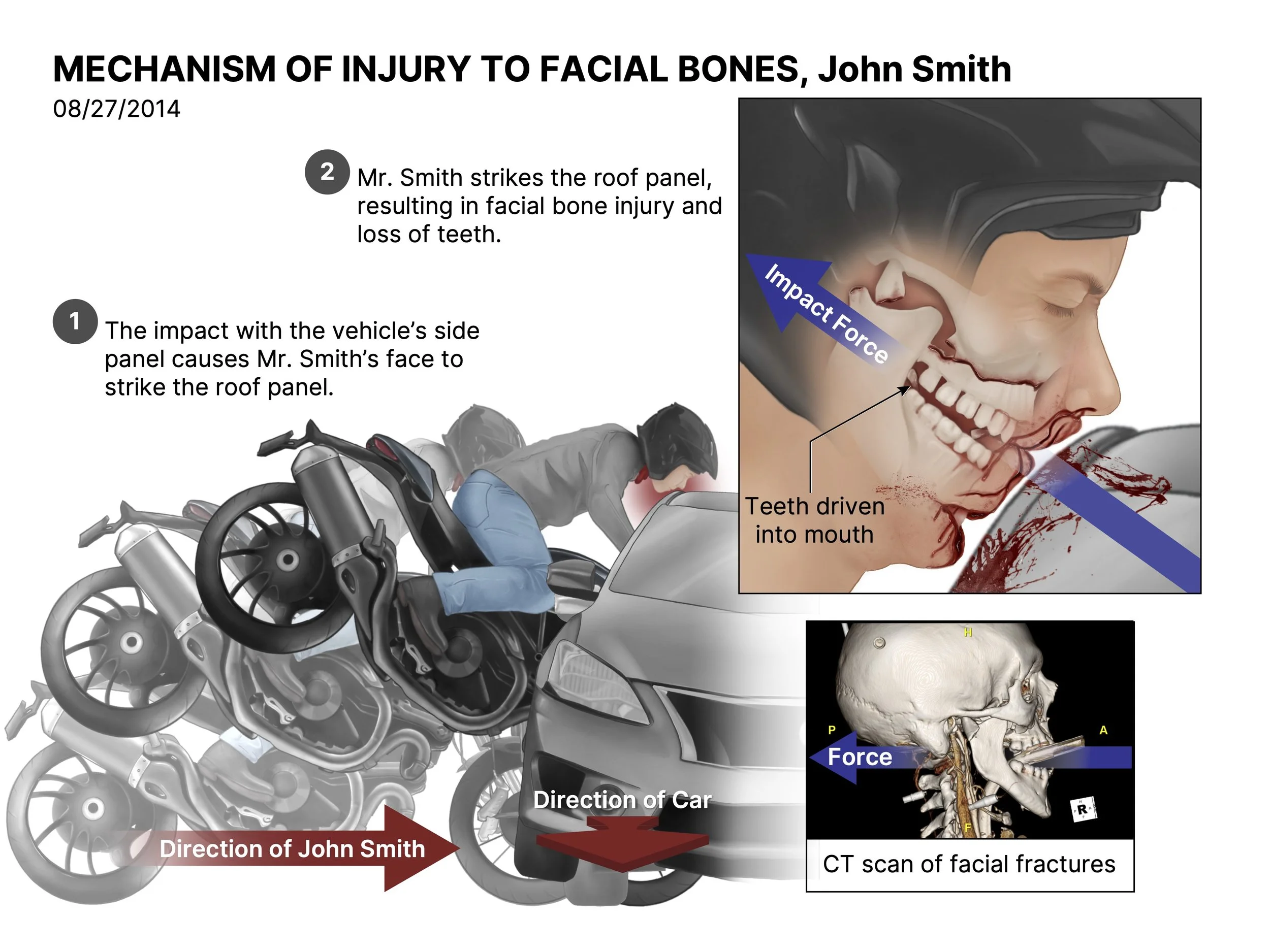 I prepared an exhibit illustrating the mechanism of injury for our ‘client’, representing John Smith, depicting the motorcycle striking the car's panel with an inset showing the precise moment of impact that caused the facial bone fractures. Because the incident report did not describe how the motorcycle contacted the vehicle, I had to research vehicle dynamics and typical motorcycle–car impact angles to determine plausible trajectories and contact points; that reconstruction informed the positioning and force vectors in the illustration. Level of soft-tissue trauma was carefully discussed with clinical experts, since many published references document findings from minutes to hours post‑injury rather than the immediate post‑impact appearance, so expert input guided interpretation of acute swelling, laceration patterns and tissue displacement. I also incorporated the CT scan into the exhibit to anchor the bony injury depiction to objective imaging, enhancing the exhibit's credibility and ensuring the visual narrative matched both biomechanical reconstruction and the medical evidence.